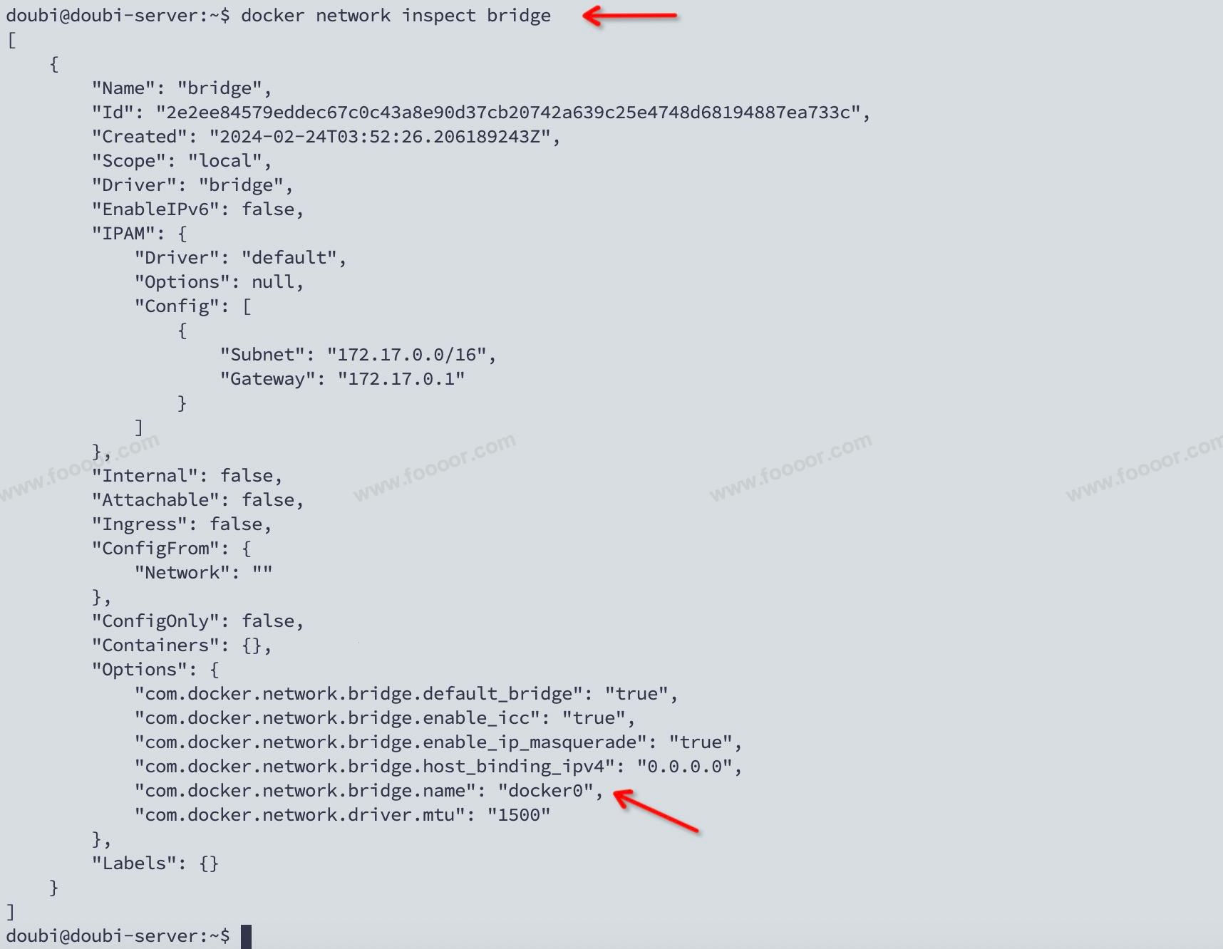 docker network inspect bridge查看名称为 bridge 的网络的详细信息:
