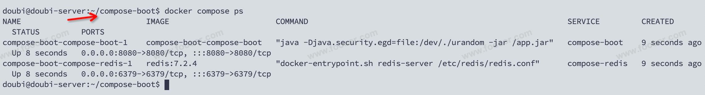可以看到因为 docker-compomse.yaml 文件所在的目录名称为 compose-boot,所以启动的容器名称前面都添加了 compose-boot,也就是容器名称为:文件所在目录名 + 服务名 。