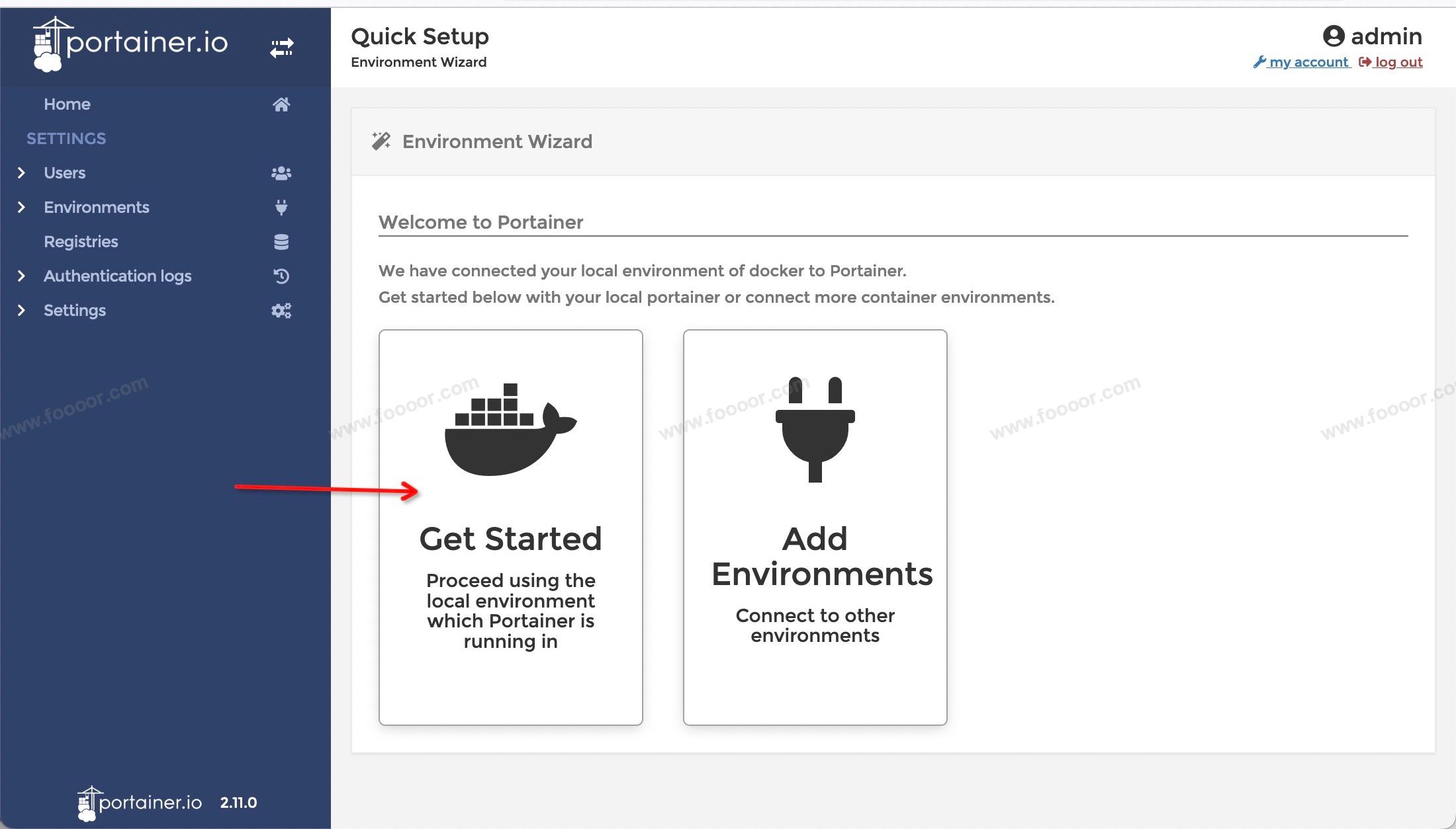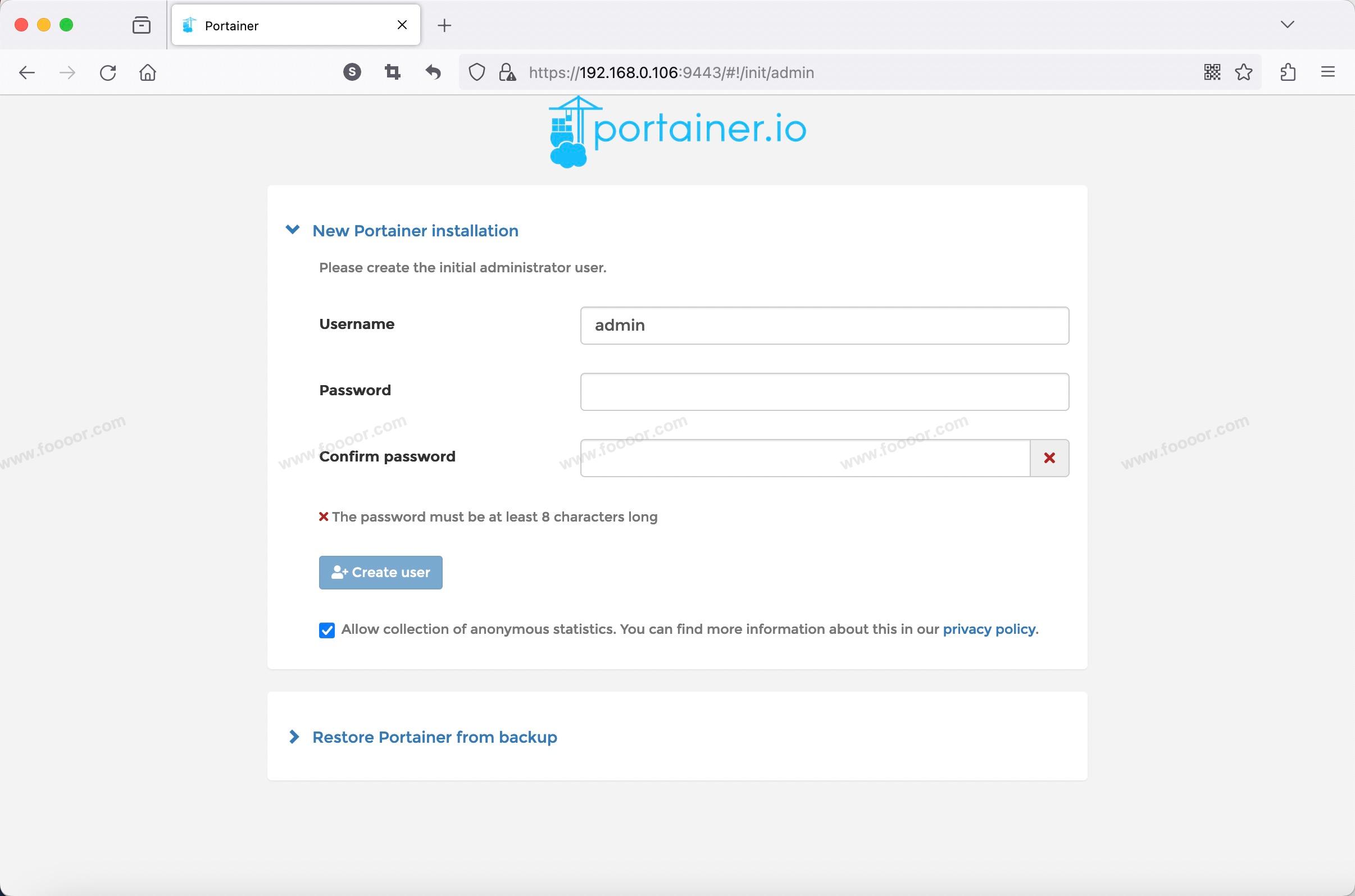 安装完成,可以通过 https://宿主机IP:9443 来访问 Portainer。注意是 https,但是证书需要信任一下。