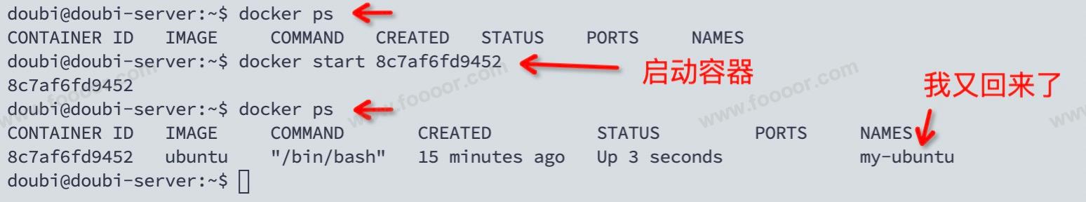 已经被停止的容器,可以使用 docker start 命令重新启动: