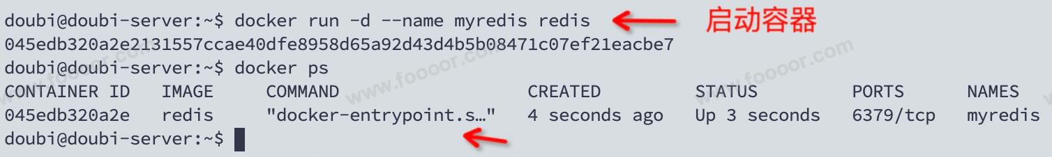 可以看到 redis 成功运行,但是如果你以 -d 的方式启动 Ubuntu 或 CentOS 容器,docker run -d ubuntu ,运行完成,查看运行中的容器发现没有对应的容器,因为 Ubuntu 和 CentOS 容器是交互式容器,没有前台进程就会退出,所以启动完就退出了。其实 redis 也可以使用交互式 docker run -it redis 方式启动,但是非常不推荐这么做。