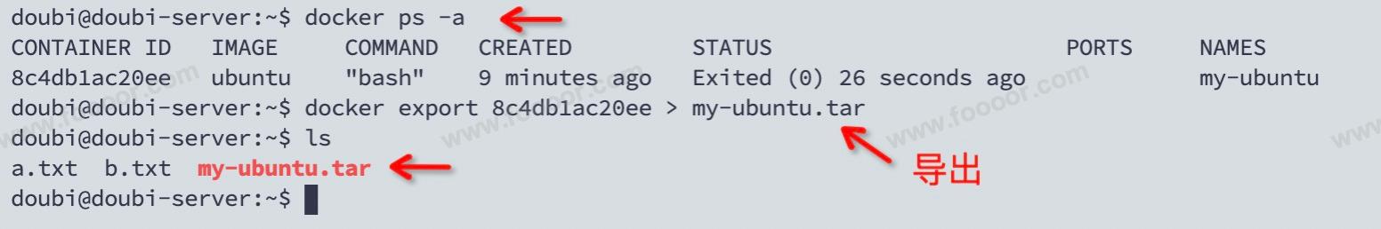 下面将 Ubuntu 容器导出为 tar 包: