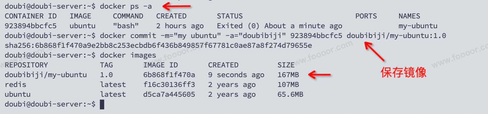 docker commit -m="提交的描述信息" -a="作者" 容器ID 镜像名:[版本标签]将 Ubuntu 容器保存为镜像: