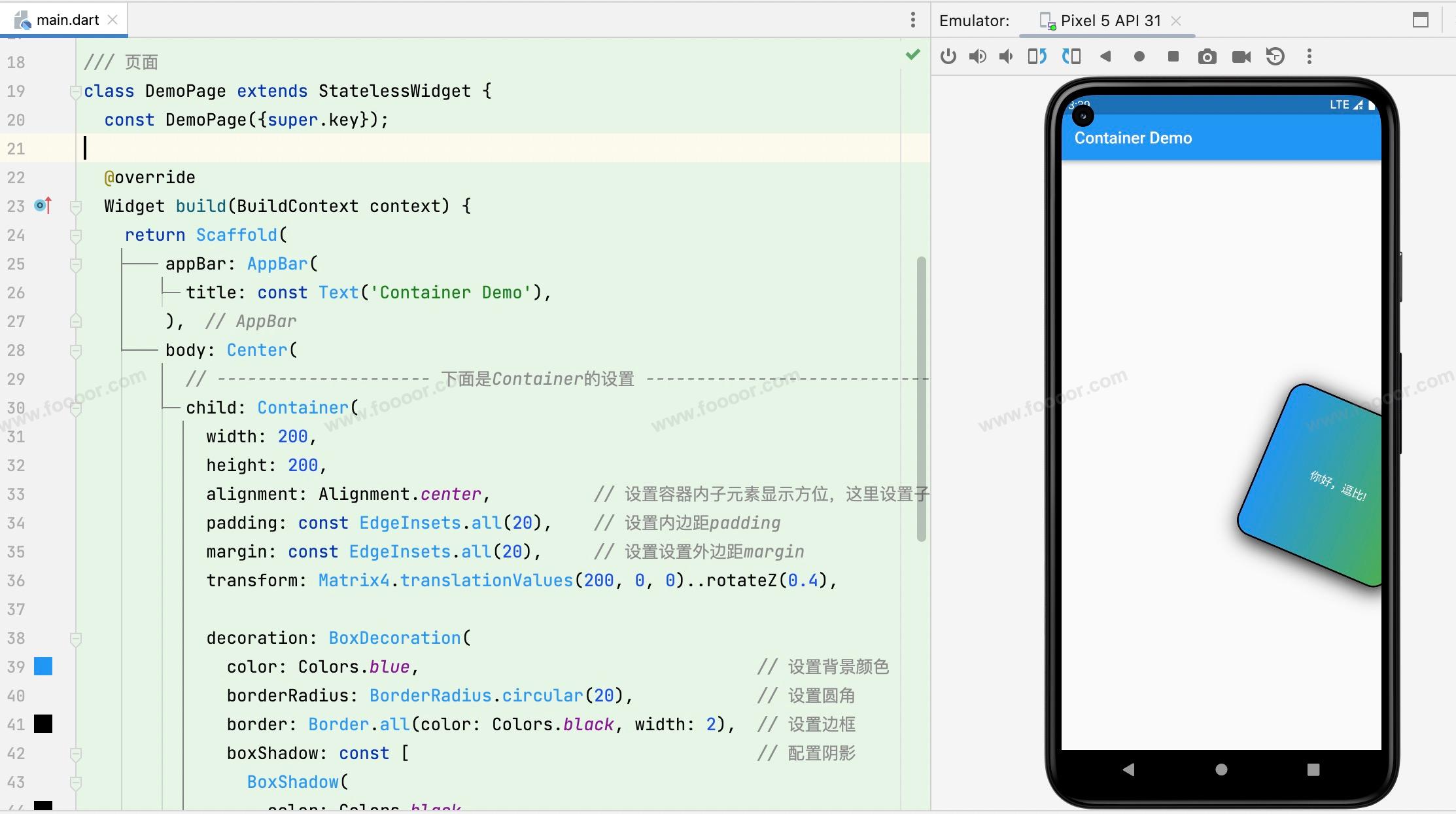 然后设置Container 组件的具体细节,设置宽高、boder、圆角、阴影、内外边距、背景或背景渐变,在 Container 中我们添加了一个子元素 Text 组件,用于显示文字,并设置显示的位置、样式。