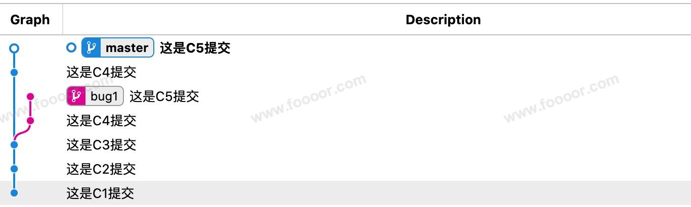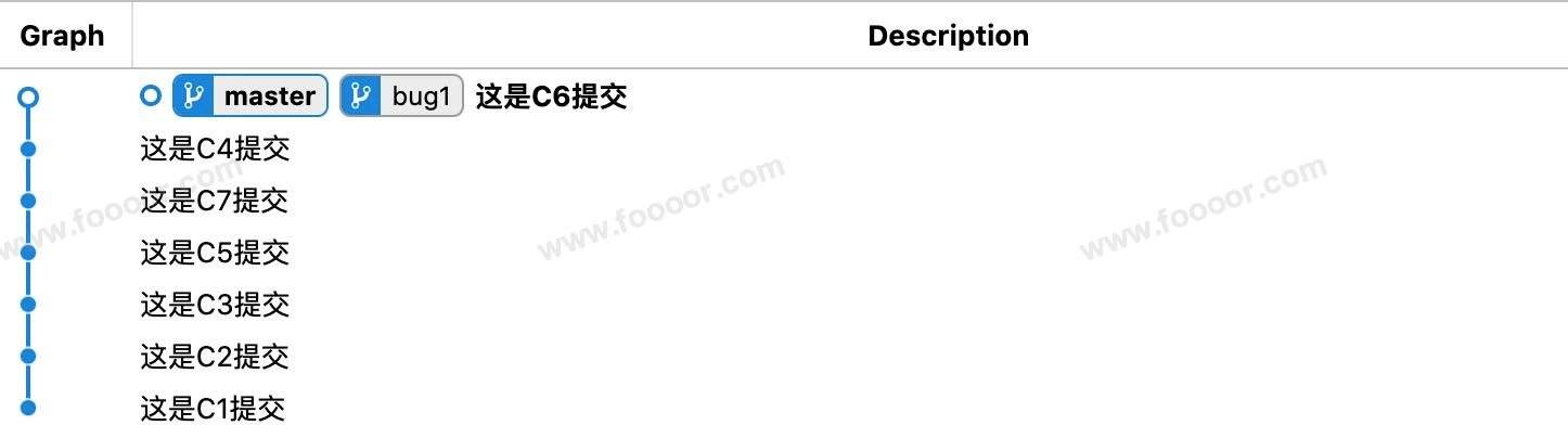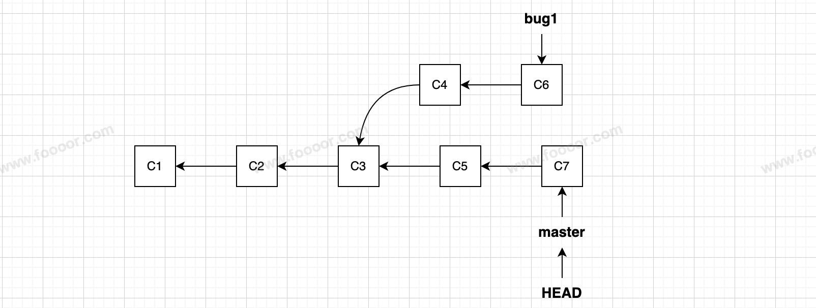 比方说我们在 master 分支上创建了 bug1 分支,然后在 bug1 分支上修改并提交了两次代码 C4 和 C6。