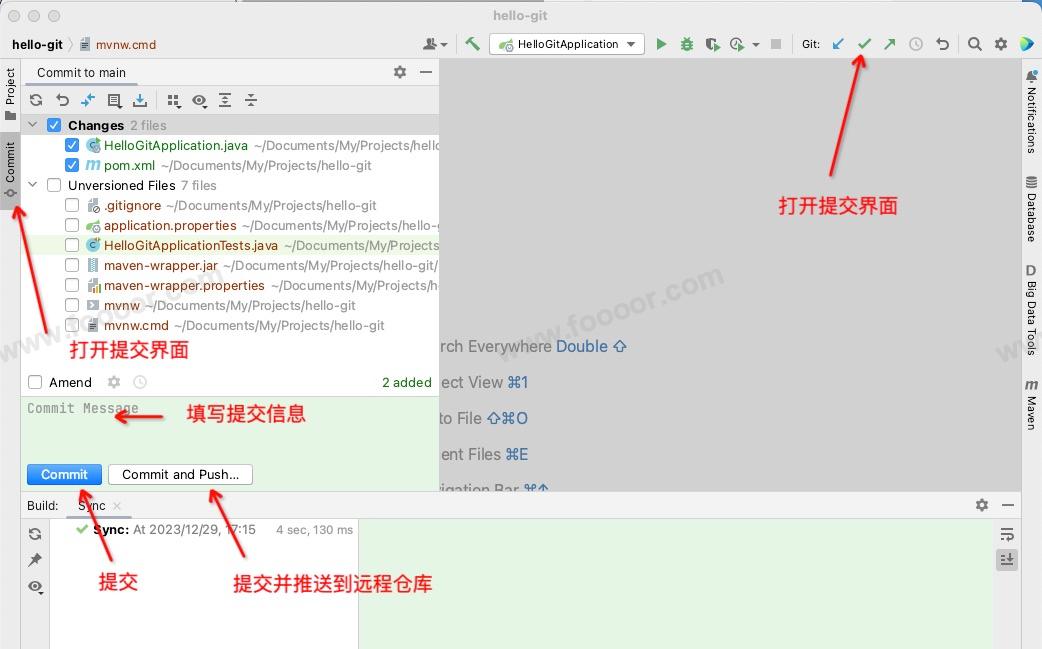 首先打开提交界面,然后勾选要提交的文件,填写提交信息,就可以提交了,还可以提交并直接推送到远程仓库。