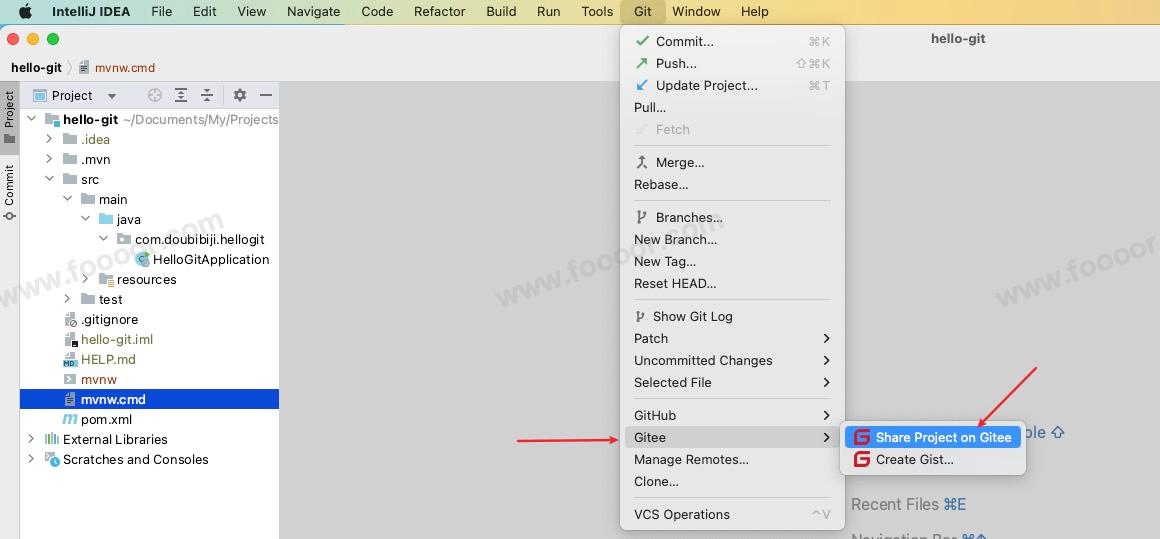 如果没有远程仓库,因为我们安装了 gitee 插件,那么可以直接将项目推送到 gitee,插件会帮我们自动创建远程仓库,非常方便。