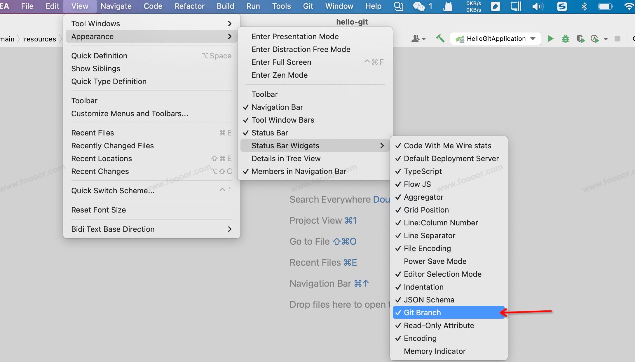 如果窗口右下角没有显示当前分支的名称,可以通过如下方式打开: