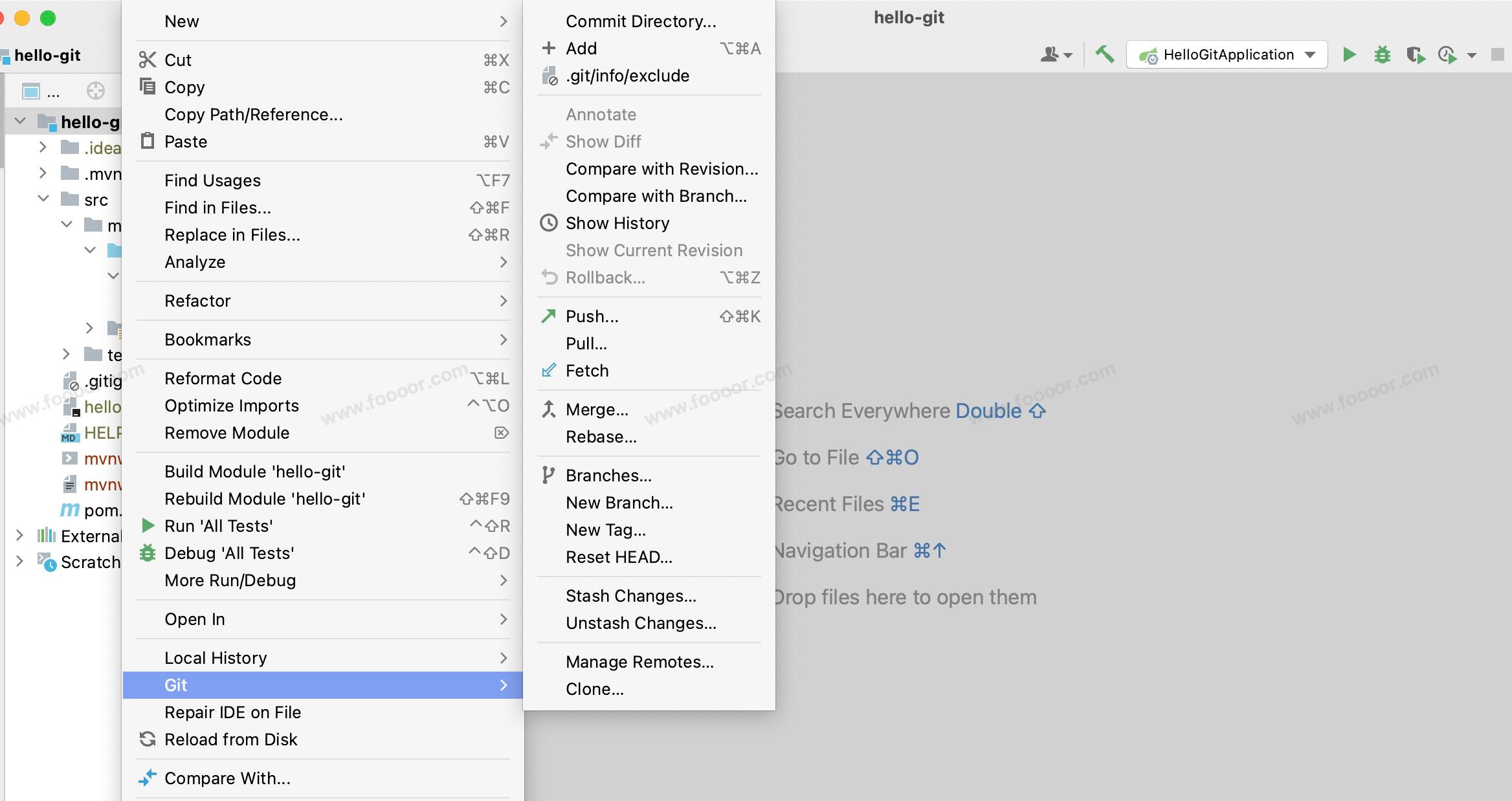 所有的操作都可以通过右击--> Git 来操作的,里面显示了很多的选项: