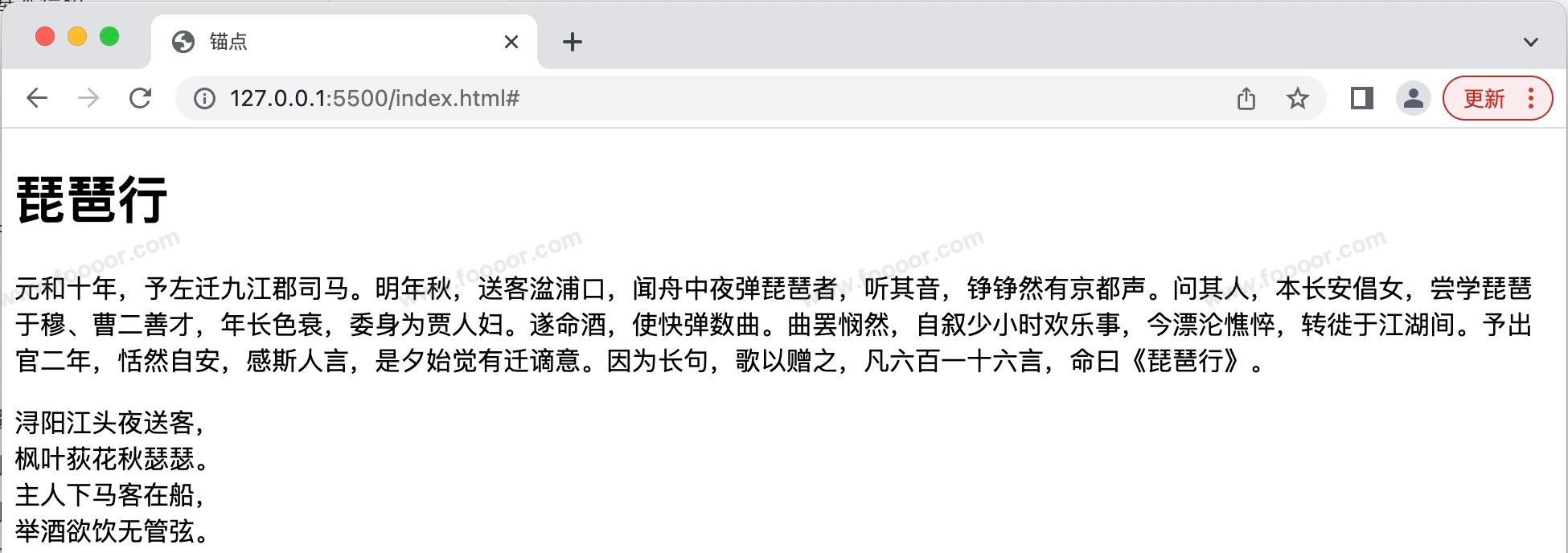 首先需要将要跳转到的位置的元素添加 id,比如我们想跳转到 ”沉吟放拨插弦中“ 开始的这段,则需要在标签上添加一个 id 属性,id 的值自己指定,但需要在当前页面唯一。