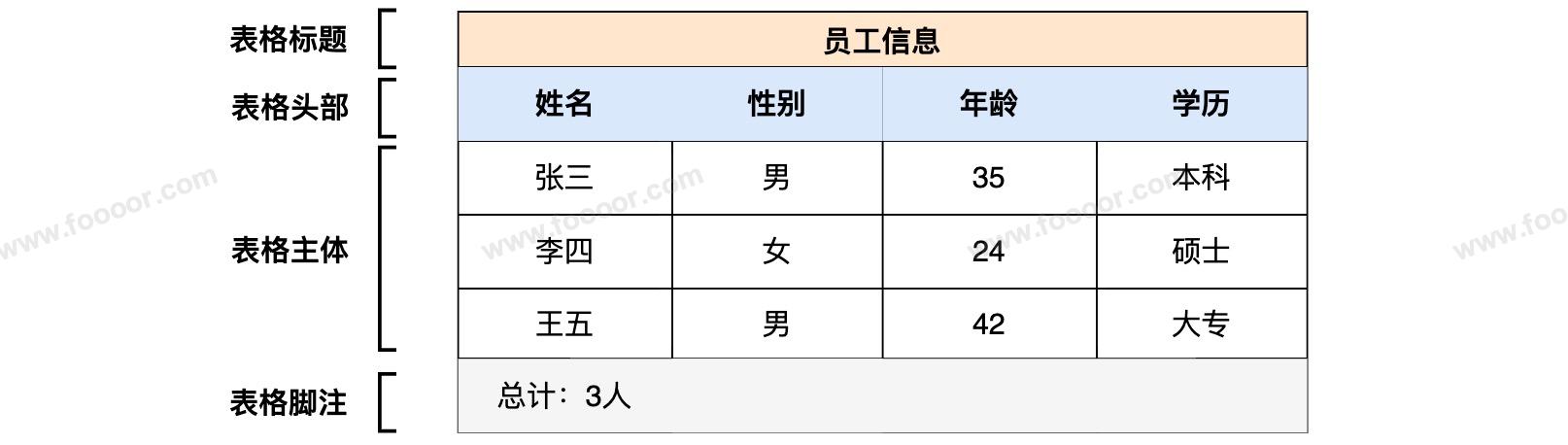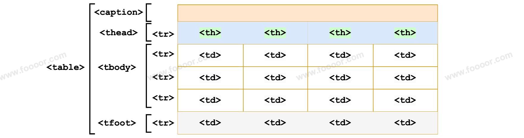 - 表格标题、头部、主体、脚注分别对应不同的标签:
