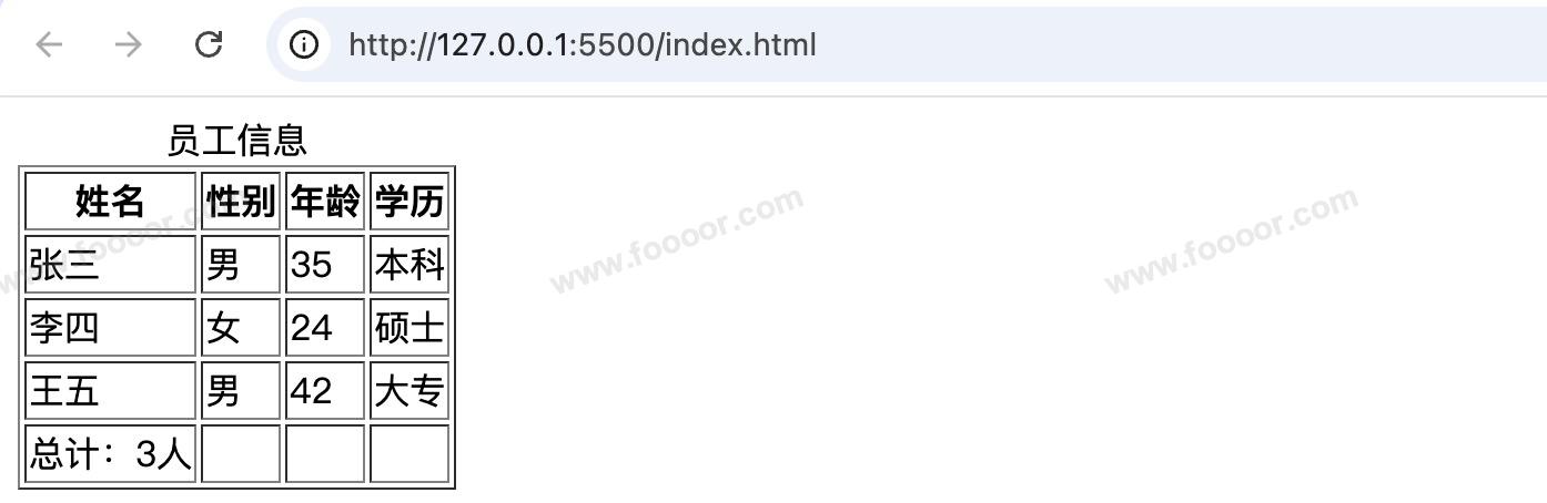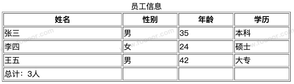 tfoot 的属性和 thead 的属性是一样的,支持 height、align、valign,但是默认的水平对齐方式是居左对齐。