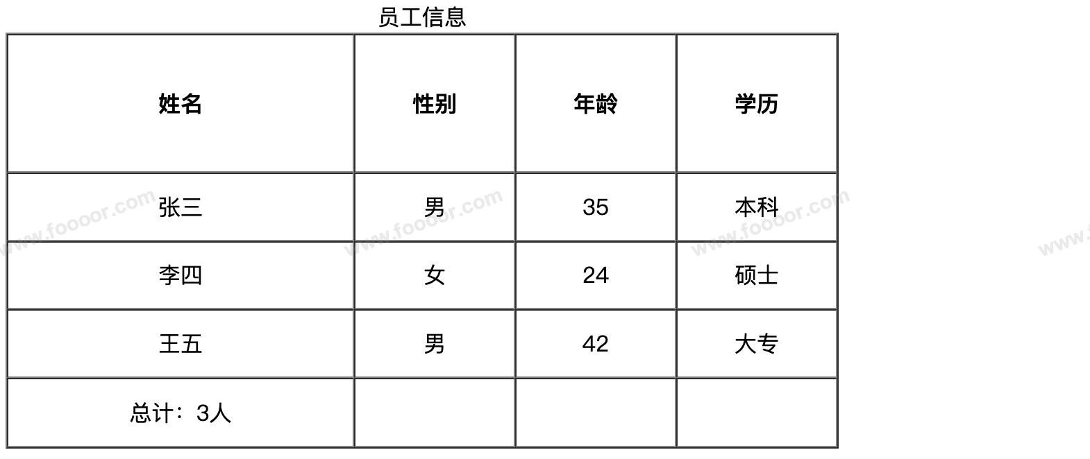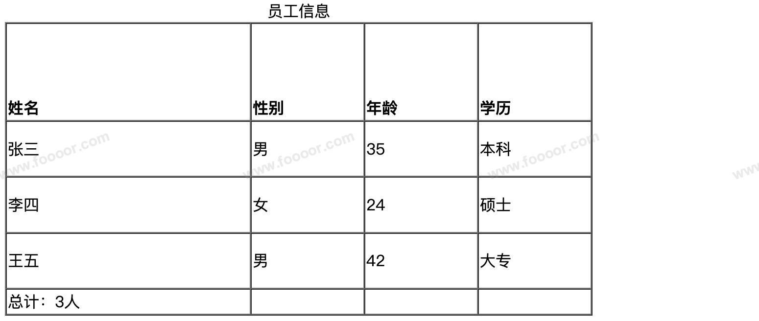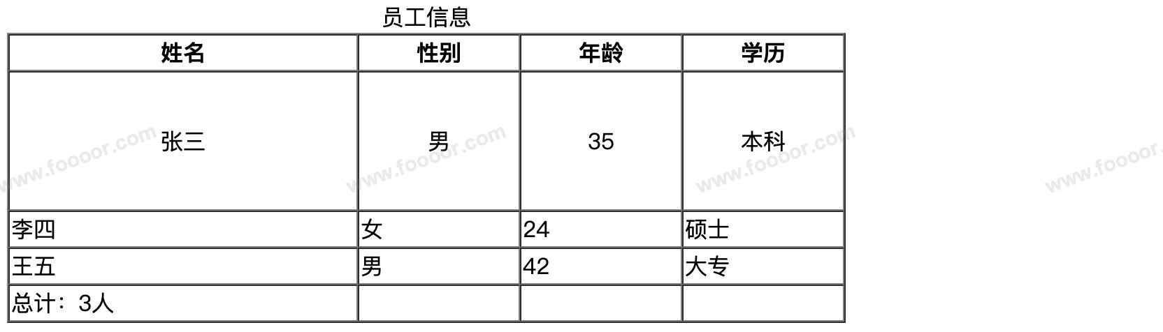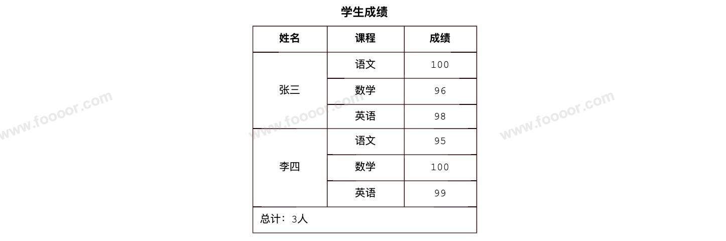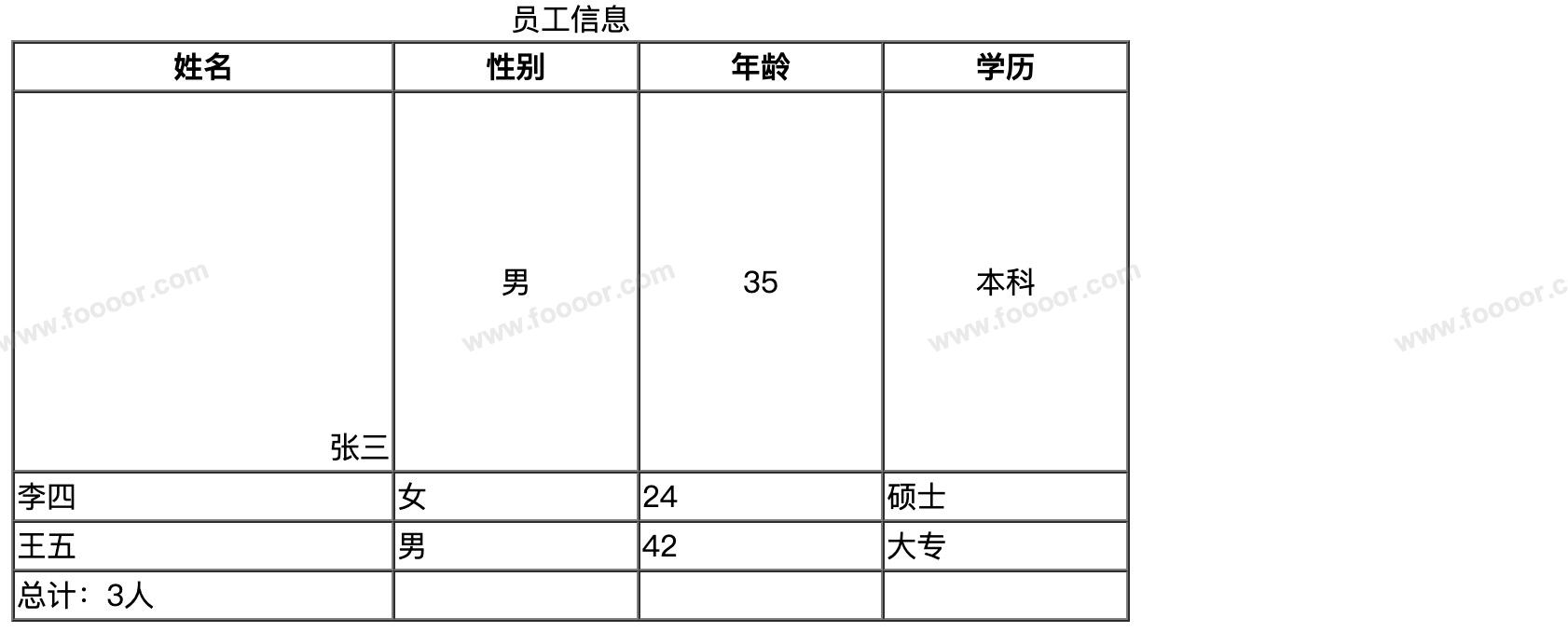 - 上面的表格 张三 和 李四 的姓名需要跨 3 行,最后一行的总计,需要跨 3 列。