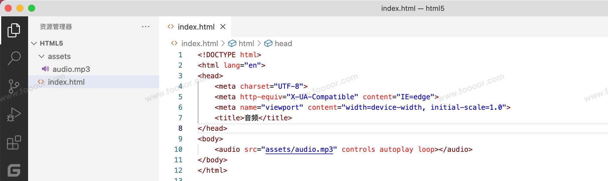 </body>使用 <embed> 标签的 src 指定文件的路径,type 指定媒体资源的 MIME 类型。音频常用的MIME 类型:audio/ogg 、audio/mpeg 。