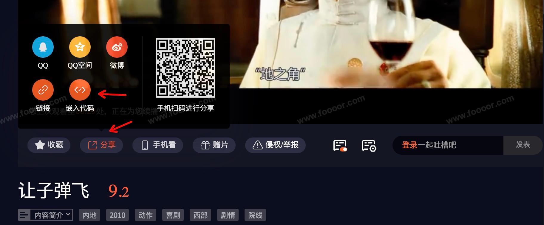 这里以腾讯视频为例,每个视频下方都有 分享 按钮,点开分享,点击嵌入代码,然后复制代码放入我们自己的网页。