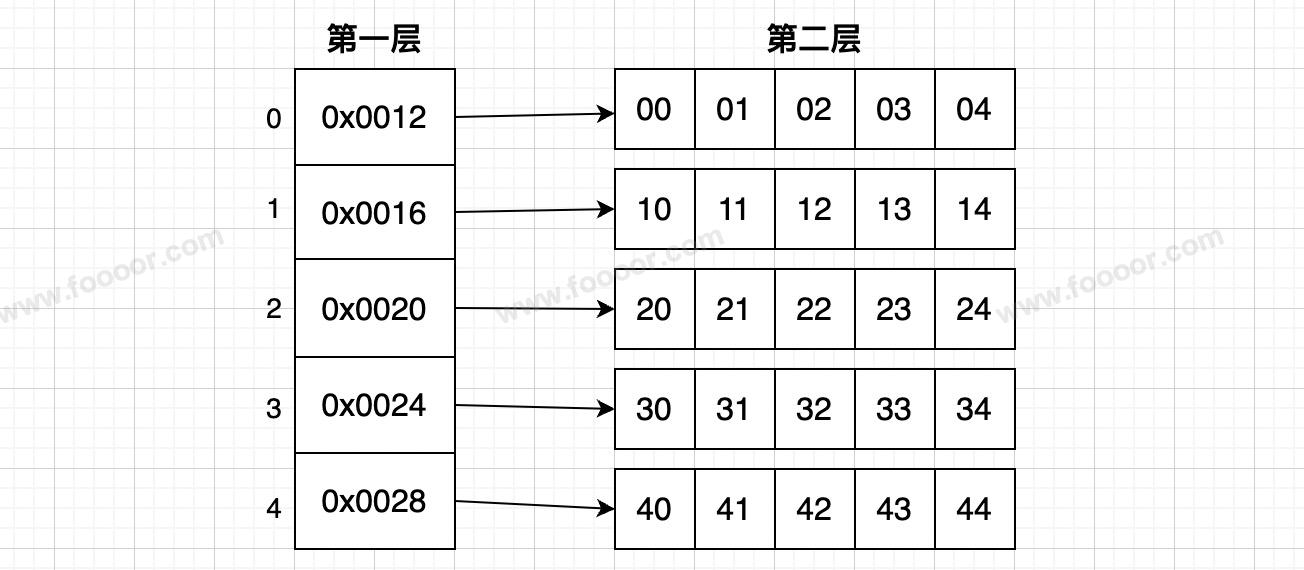 也就是一个一维数组中的每个元素,存储的都是一维数组的地址,地址指向的都是第二层一维数组,如下图: