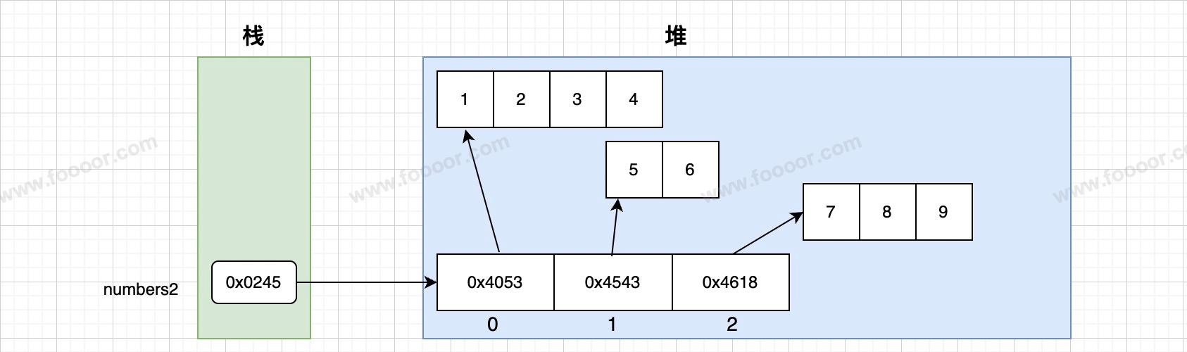 int[][] numbers2 = new int[][]{{1,2,3,4}, {5,6}, {7,8,9}};内存结构如下: