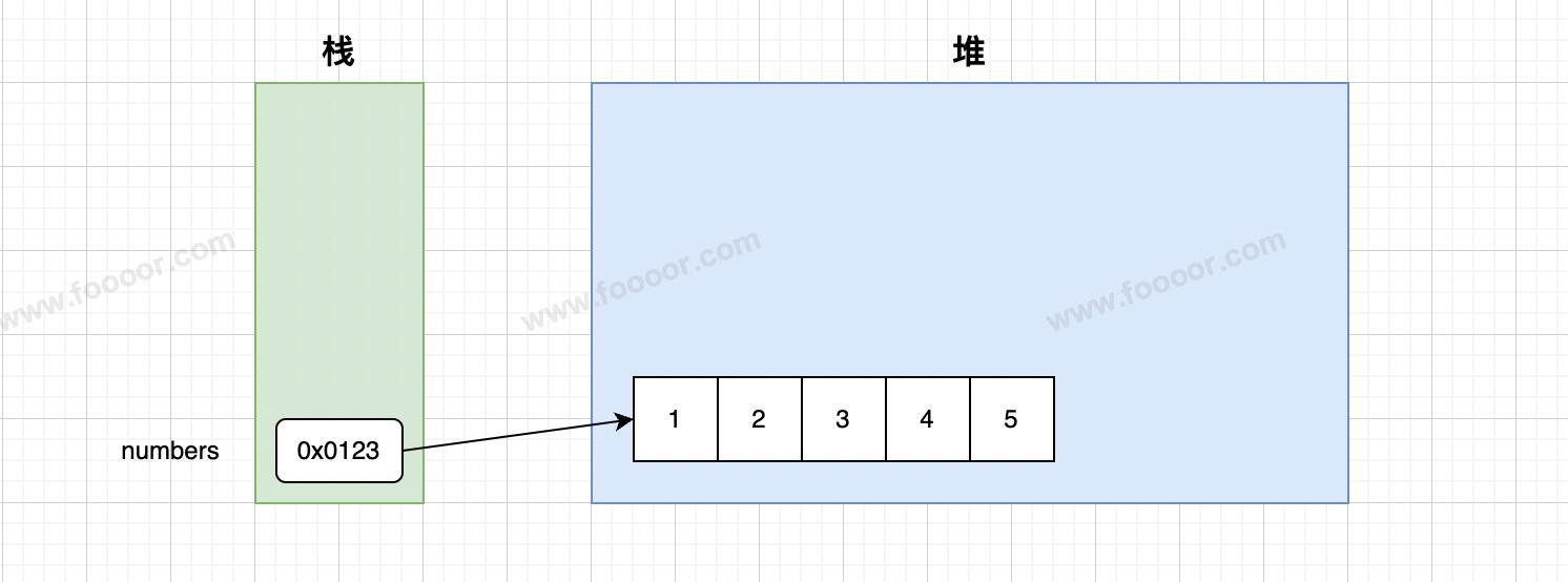 内存中会有不同的存储数据的区域,这里使用的有栈和堆,栈中存放的是局部变量,也就是方法中定义的变量,现在我们定义的变量都是在方法中的,也就是 main 方法,所以 numbers 变量是存储在栈中的,但是右边的数组值是存储在堆中的,numbers 变量中存储的是一个地址值,是数组的首地址(第一个元素的起始地址,也就是1的起始地址,上面的地址值是胡诌的)。
