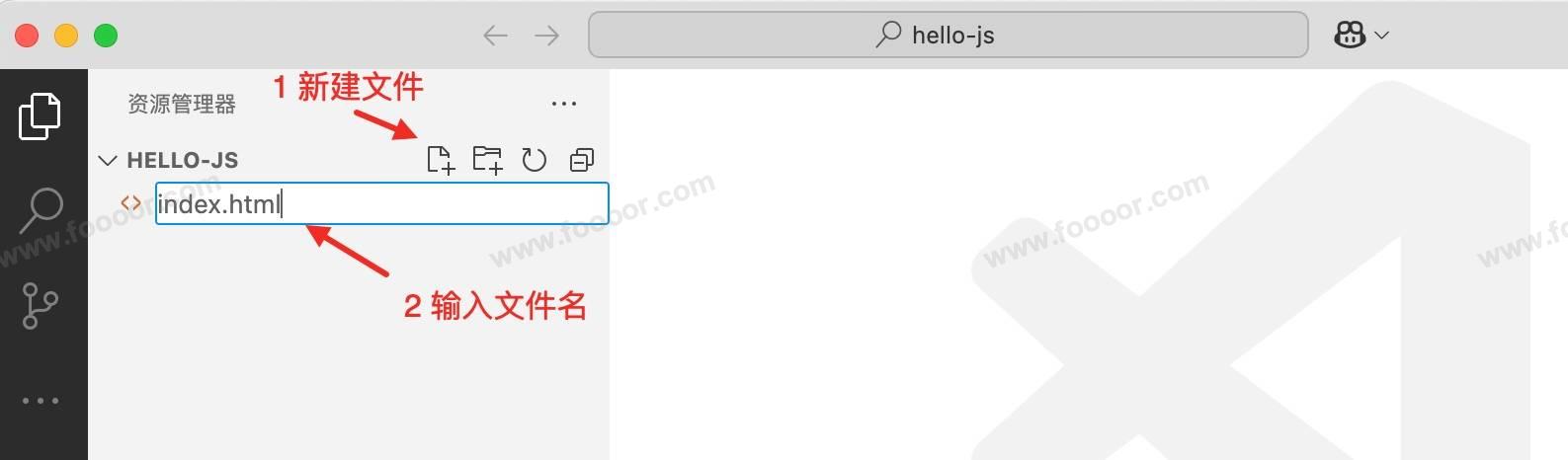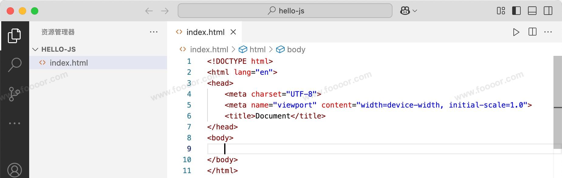 首先在指定的目录下(自己想放的路径下)新建一个文件夹作为工作区,例如我这里新建了一个 hello-js 的文件夹,然后打开VS Code,用 VS Code 打开新建的文件夹。