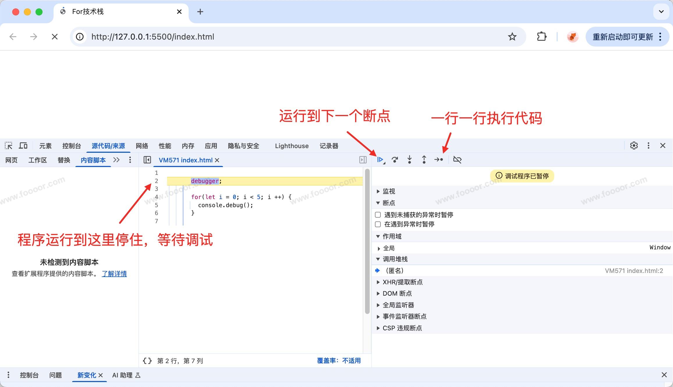 </script>- 上面的程序,执行到 debugger 的地方,会停住,等待调试。