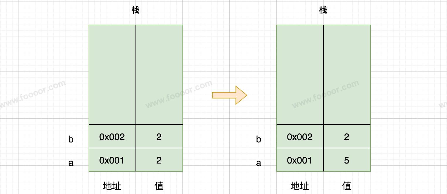 let a = 2;会在栈中为 a 分配内存空间,并赋值为 2;let b = a;会在栈中位 b 分配内存空间,并复制 a 的值给 b;a = 5;会修改 a 的内存空间的值为 5,并不会修改 b 的值。