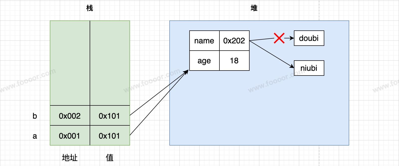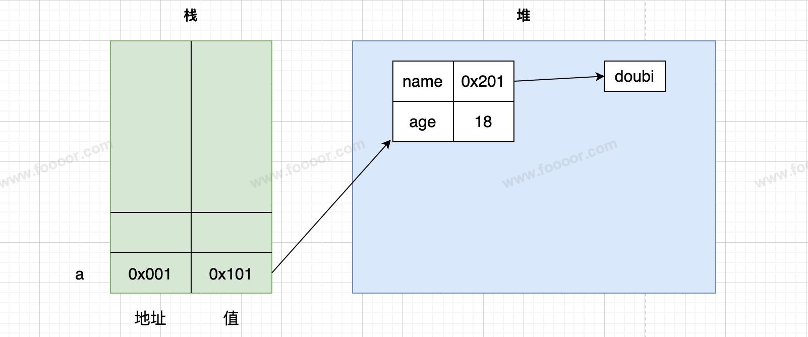 let a = {name:'doubi', age:18} ,栈和堆都分配内存空间,栈指向堆中的内存空间: