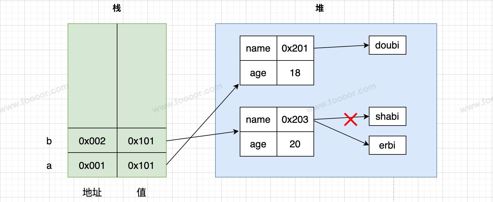 b = {name:'shabi', age:20} ,在堆中新建了一个对象,开辟了新的内存空间,将 b 指向新的内存空间。