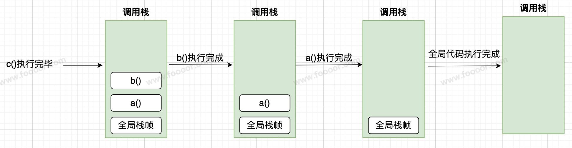 当调用 a() 函数,会将 a() 函数压入调用栈,当 a() 函数调用 b() 函数,会将 b() 函数也压入调用栈,依次类推,将 c() 函数也压入调用栈。栈帧中包含函数中定义的变量和函数声明等。