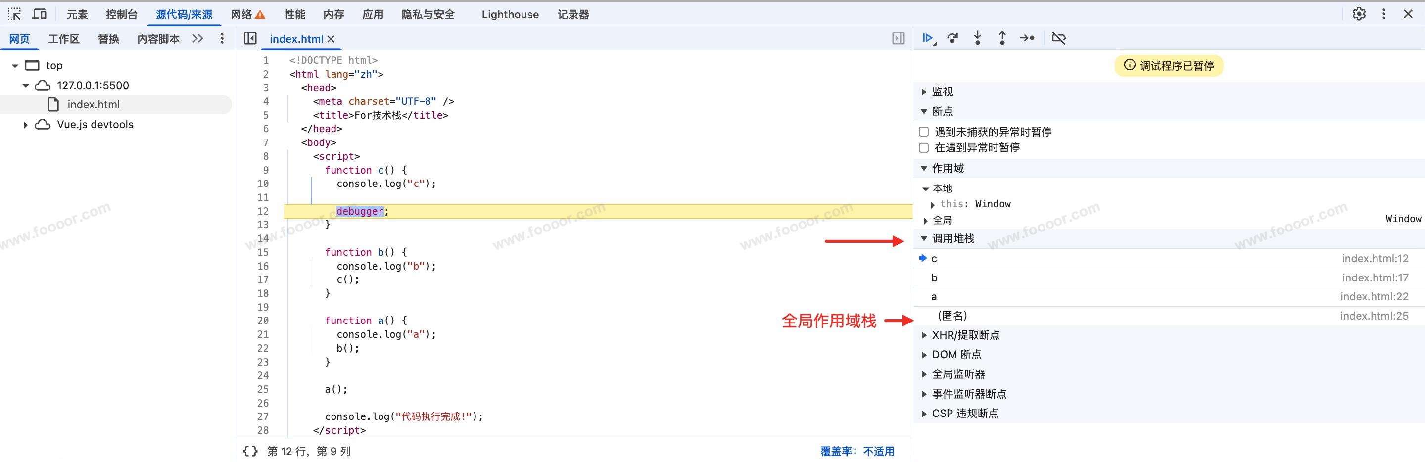 代码在执行的时候,我们可以使用浏览器的开发者工具,通过添加断点 debugger 来查看调用栈,如下图: