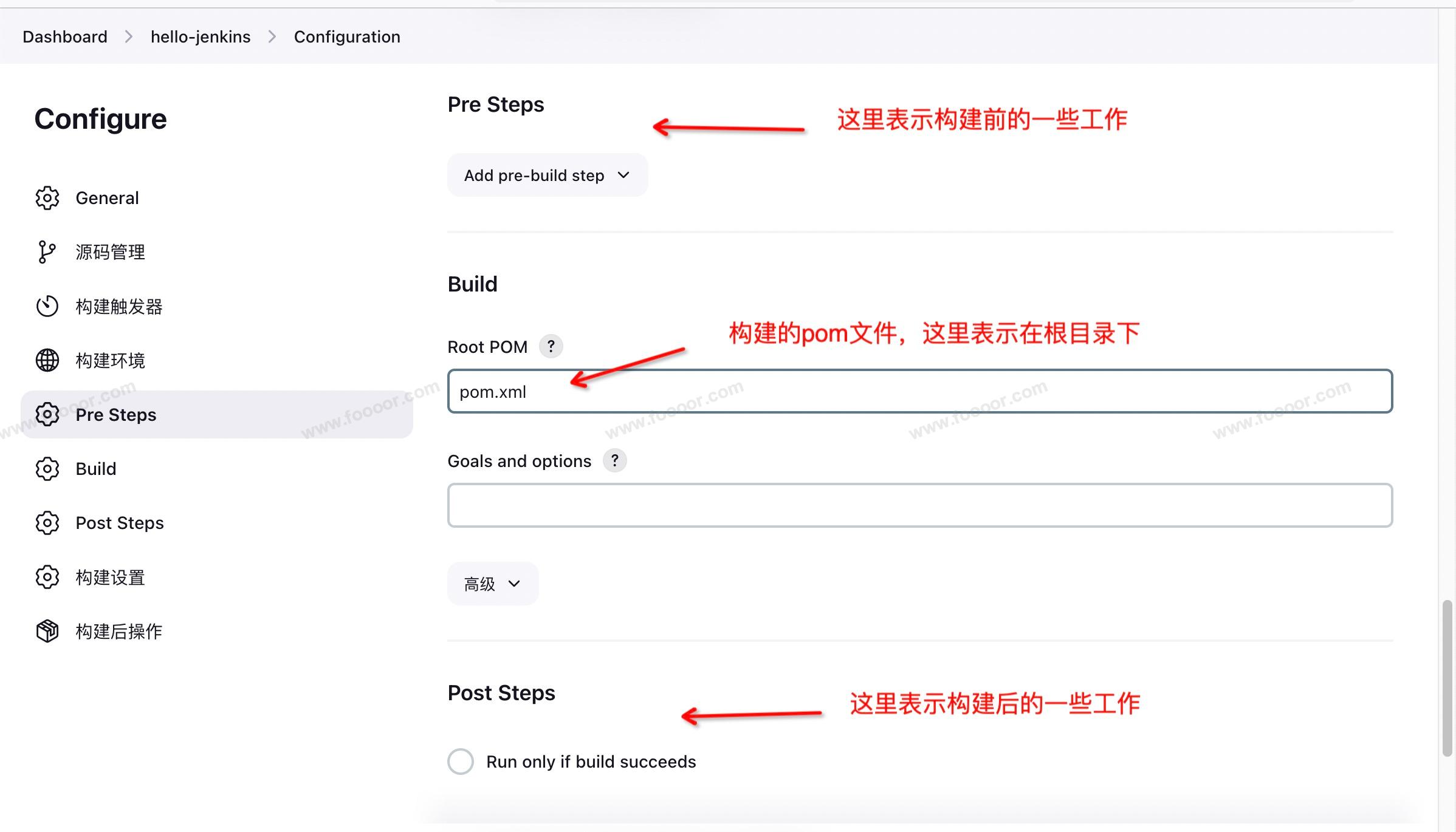 - Pre Steps :表示构建前的工作,例如要执行一些脚本,这里我们不需要;