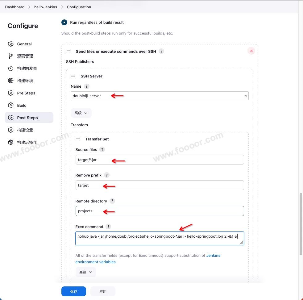 target目录一起复制,会变成/home/doubi/projects/target/hello-springboot-0.0.1-SNAPSHOT.jar,这里将target路径删掉。Exec command :表示上传完成执行的命令,这里直接运行 jar 包,注意要使用 nohup 命令,在后台运行,并指定日志的输出,否则可能以为执行超时而失败。
