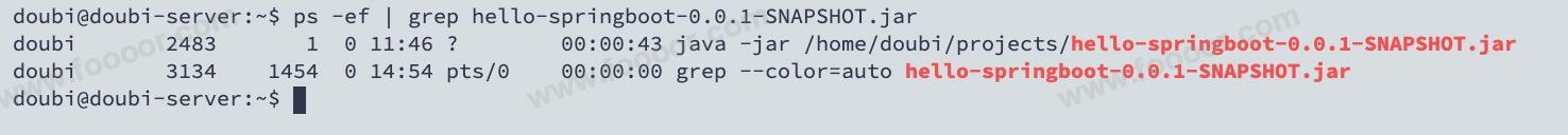 grep $fileName 就是过滤名称带有 hello-springboot-0.0.1-SNAPSHOT.jar 的进程,如下图: