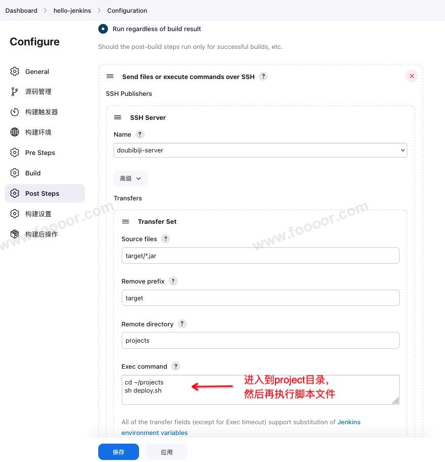chmod +x deploy.sh脚本写好了,现在让 Jenkins 直接在上传完文件执行这个脚本就可以了。