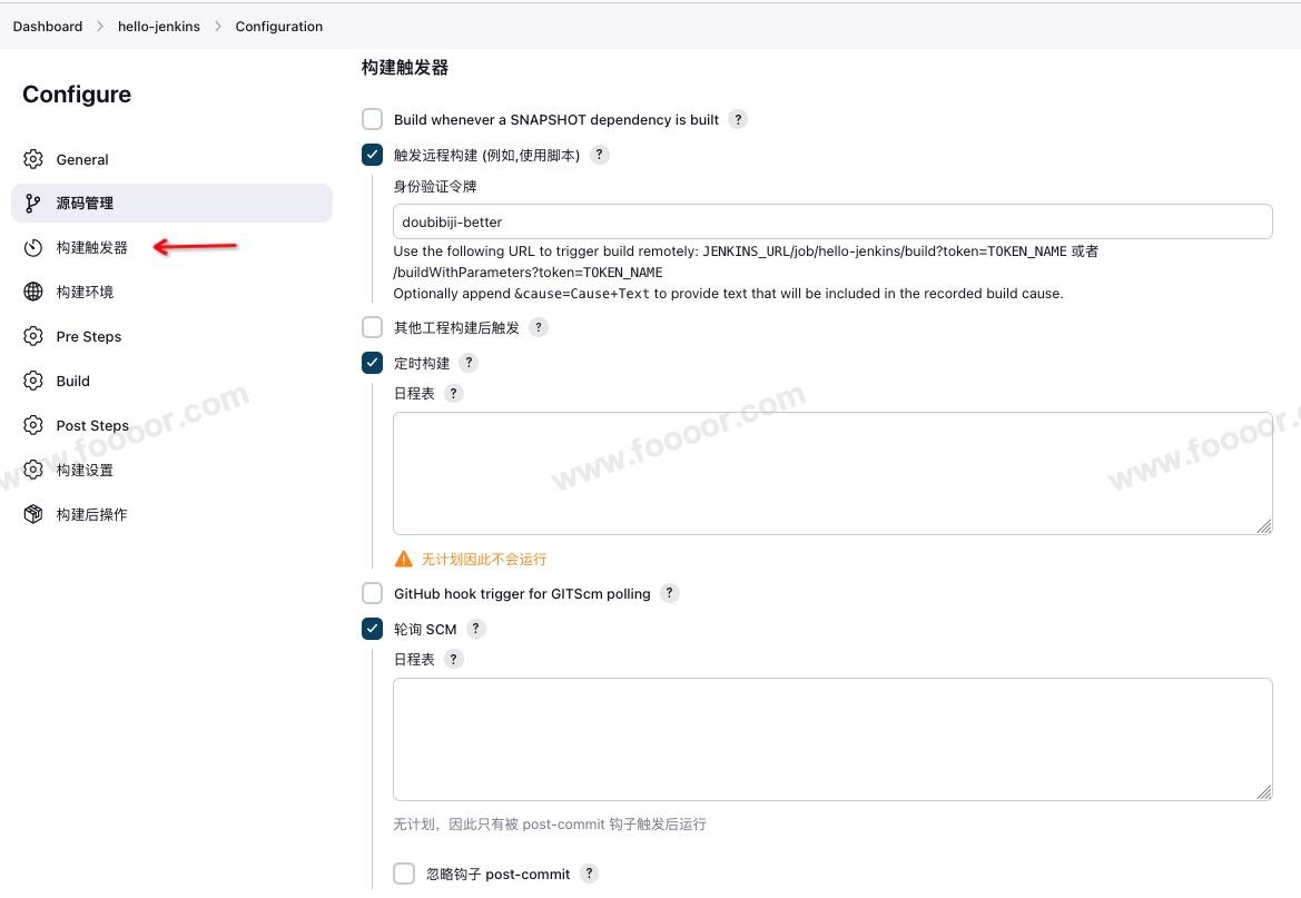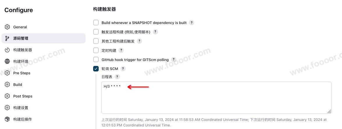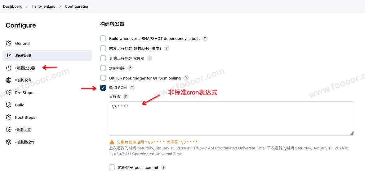 方式和 轮询 SCM 的配置方式是类似的,也是使用 Jenkins 非标准的 cron 表达式。