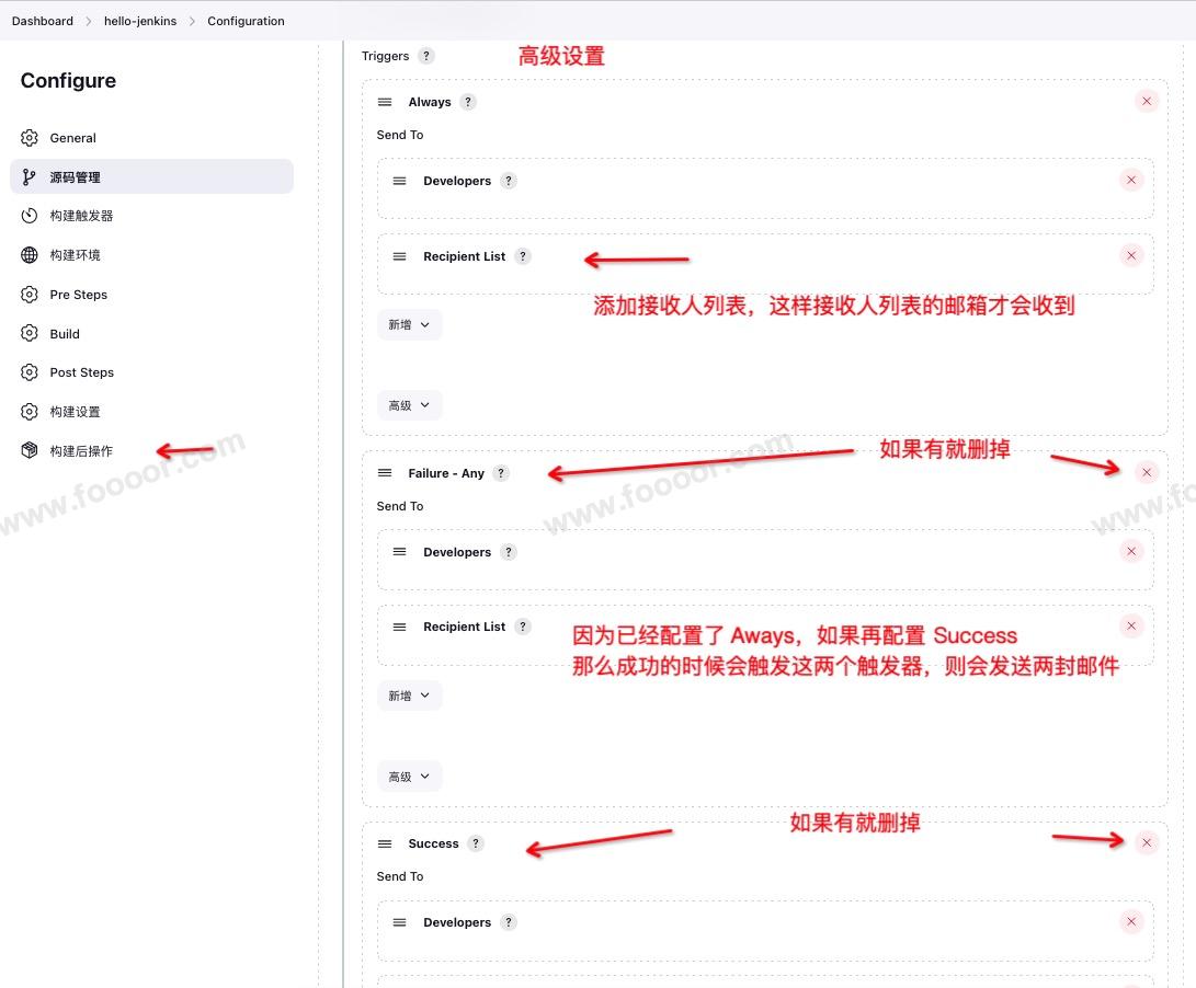 如果针对 Failure 和 Success 也配置接收人列表,则会发送两次邮件,所以如果有 Failure 和 Success,就将其删掉。