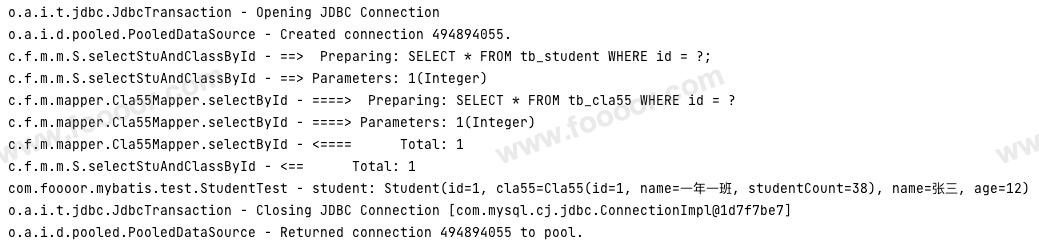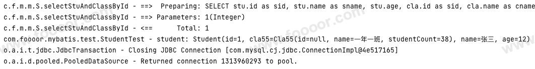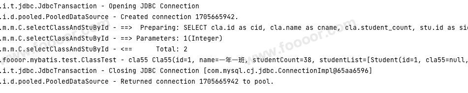 }执行结果如下,虽然上面单独执行 SQL 查询的是多条记录,但是 Cla55 信息是一样的,可以映射为一条 Cla55 对象: