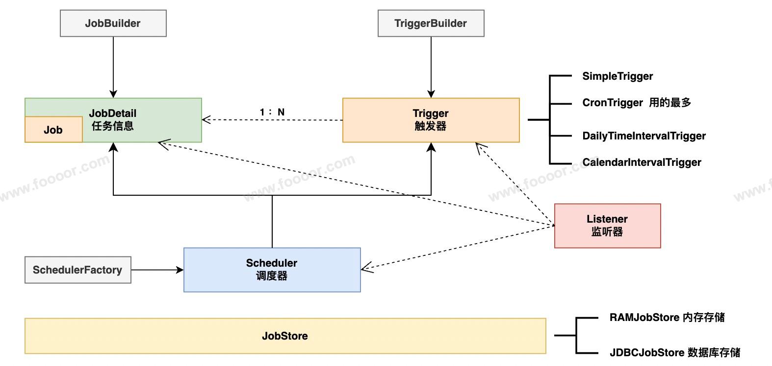 在使用的时候,通过 JobBuilder 构建 JobDetail,JobDetail 对 Job 进行了包装,添加了更多的信息描述。
