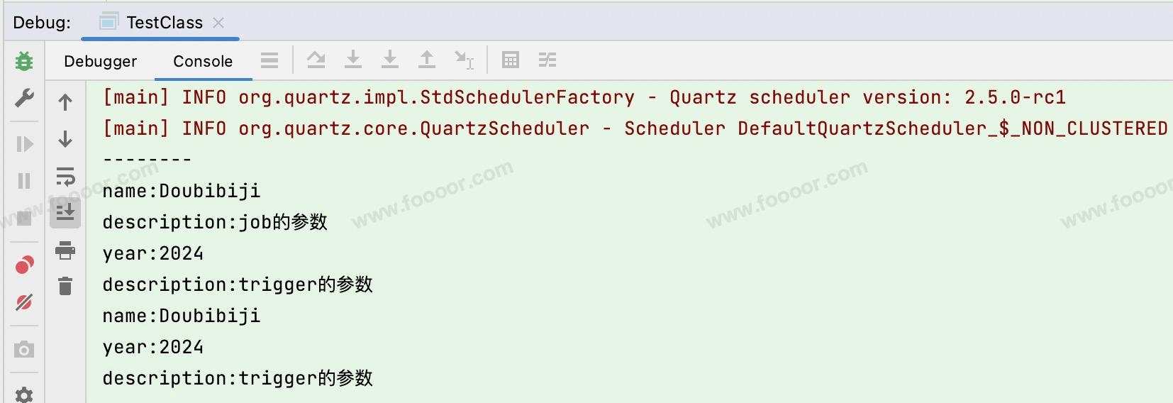 接收参数有两种方式,一种是在 Job 中获取到 JobDataMap 对象,通过 JobDataMap 获取参数。一种是通过 Job 中的属性来接收参数。