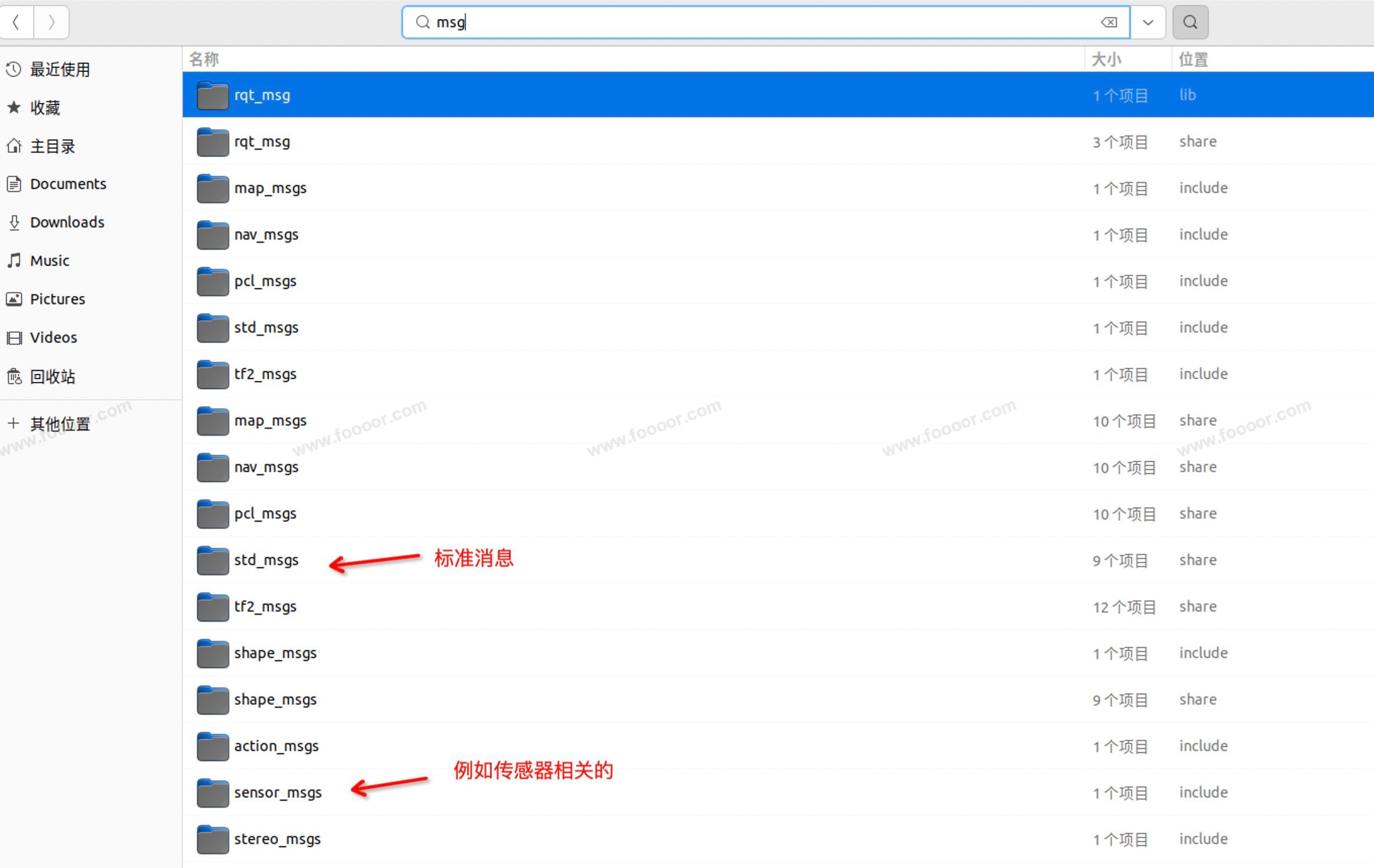打开 /opt/ros/humble/share 路径下,分别搜索 msg ,可以看到有很多的文件夹,打开其中的文件夹,里面包含了很多的通信接口: