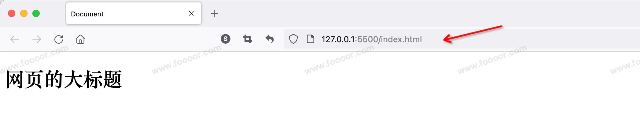 会看到地址栏的地址和之前我们直接在本地打开文件有所区别,这是因为 Live-Server 是以服务器的方式运行编写的页面,我们在浏览器实际是请求服务器获取到页面的内容。