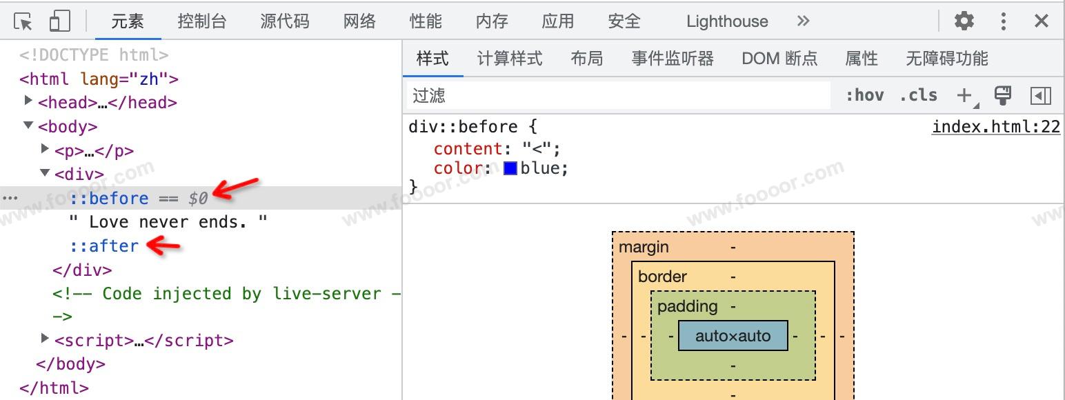 通过开发者工具可以查看到伪元素,可以看到 ::before 和 ::after 的位置,是在元素最前端和最后端的位置: