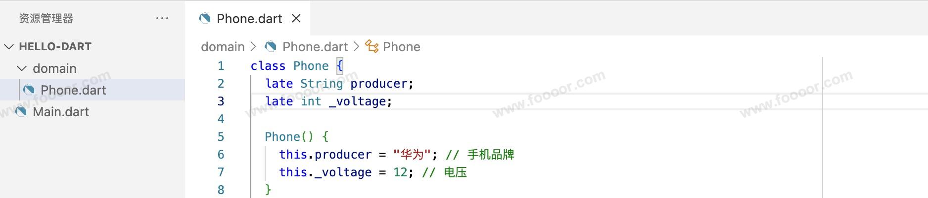 现在重新创建一个 Phone.dart 文件,将 Phone 类的定义放在 Phone.dart 文件中: