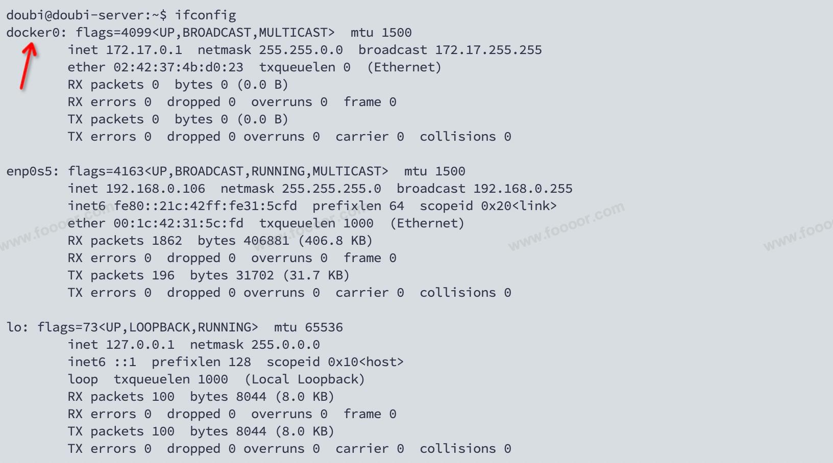 在启动了 Docker 之后,使用 ifconfig 命令查看网络信息,可以看到一个 docker0 的网络: