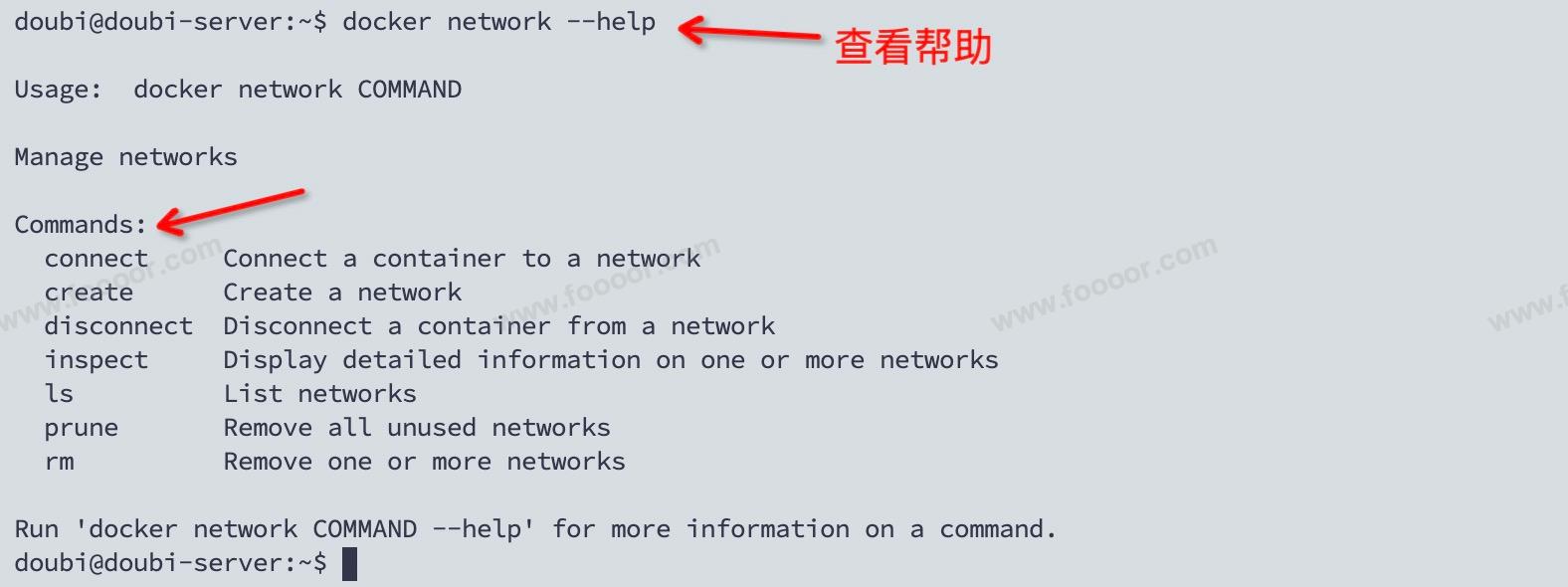 可以看到 docker network 有 connect 、create、disconnect、inspect、ls、prune、rm 命令。