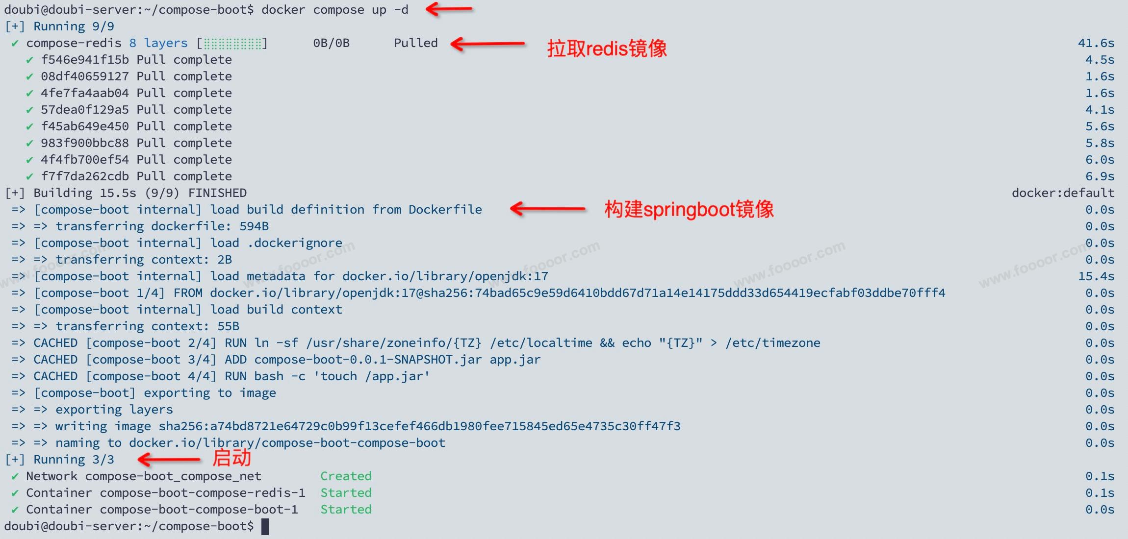 启动后,会自动下载镜像和通过 Dockerfile 自动构建镜像,并启动服务: