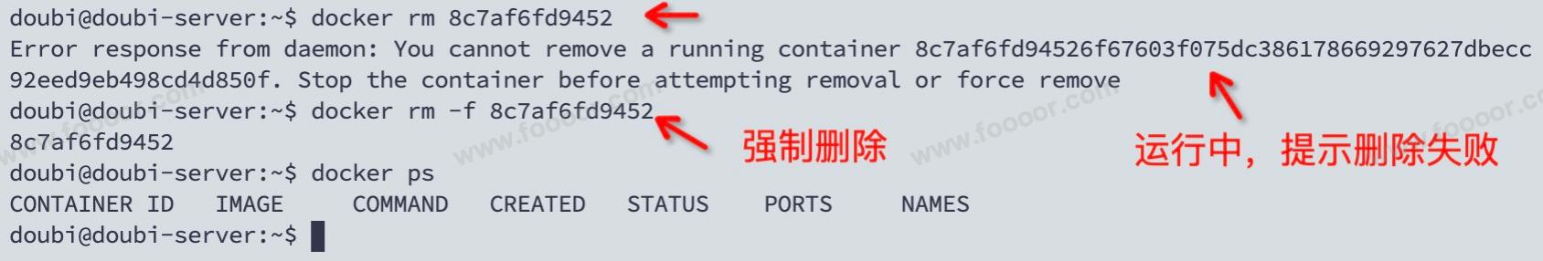 docker rm -f 容器ID/名称如果是运行中的容器使用 docker rm 容器ID/名称 命令删除会失败,需要 -f 参数进行强制删除。