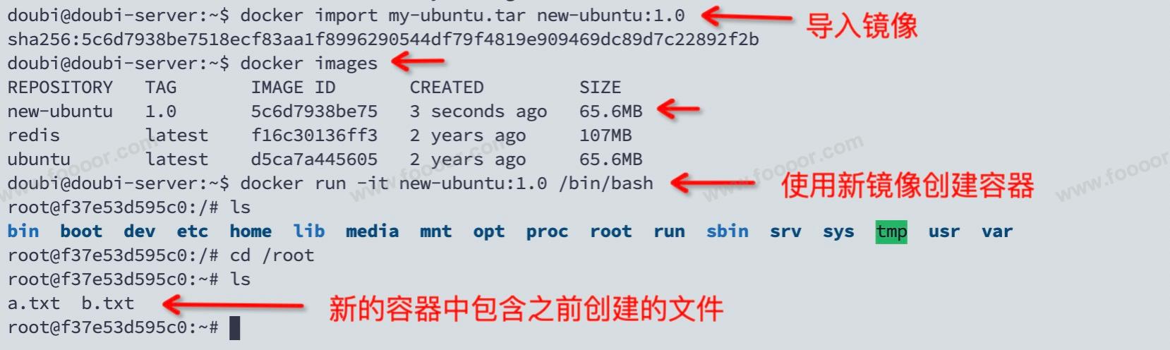 下面通过命令将 tar 包导入为一个新的 Ubuntu 镜像,然后使用新的镜像启动为一个容器: