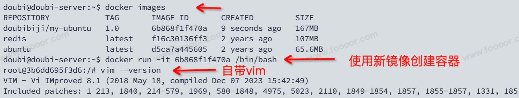 下面使用刚才保存的新镜像来创建容器,这样创建的容器就自带 vim 了。