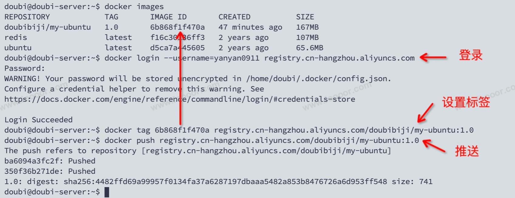 docker push registry.cn-hangzhou.aliyuncs.com/doubibiji/my-ubuntu:[镜像版本号]执行: