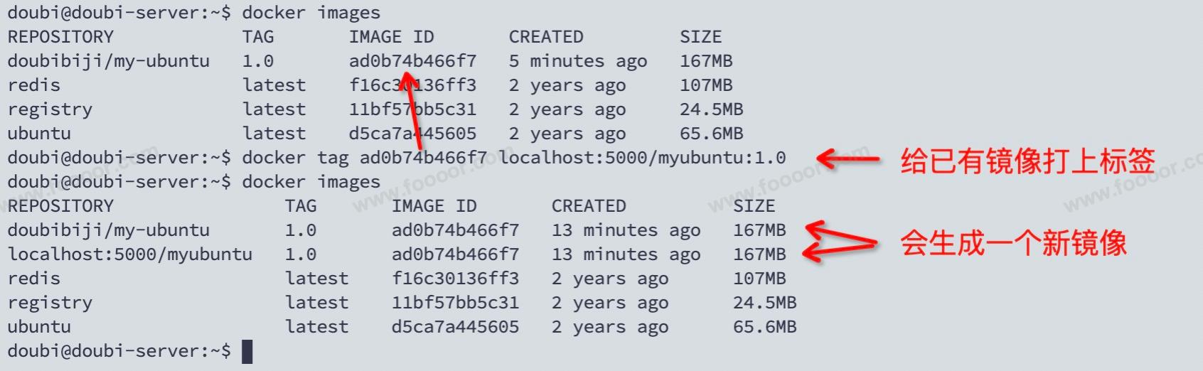docker tag ad0b74b466f7 localhost:5000/myubuntu:1.0